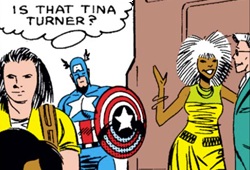 Switching into his Captain America persona, Steve Rogers uses his Avengers ID card to gain backstage access at AmericAid. “Wow!” Captain America thinks to himself. “It’s like the who’s who in pop music back here. Thanks to Bernie broadening my musical tastes while we were an item, I actually recognize most of these musicians. Is that Tina Turner?”
