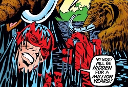 Although Daredevil arrives in time to rescue Karen Page, the resulting battle between hero and villain – in front of a life-sized woolly mammoth – results in Daredevil sinking into the La Brea Tar Pits himself. Brother Brimstone, who turns out to be Strange Secrets co-star Vince Sterling, likewise falls into the gooey substance. While Daredevil’s agility allows him to escape, the weight of Lester Leroy’s exoskeleton causes Sterling to quickly sink.